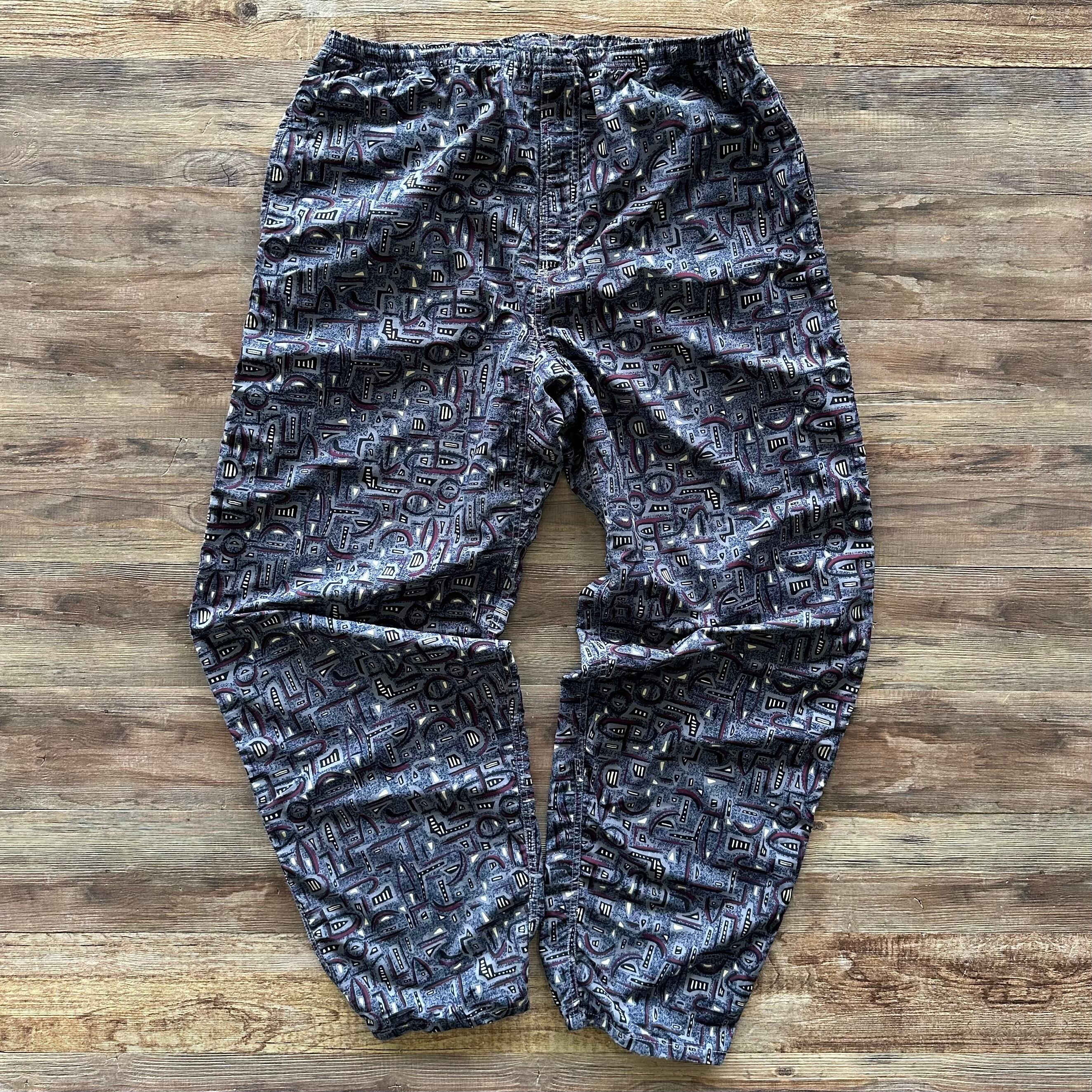 ノースフェイスの総柄ナイロンパンツ。シルエットは太めです。薄手で軽くて動きやすいのでアウトドア活動にぴったりです。運転や長時間の移動など旅のお供にオススメなリラックスお洒落パンツです。